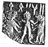 A képen ember két állat között: Mint az egyiptomi Gebel-elaraki kés vagy Édenből Ninbanda pecsétjén...